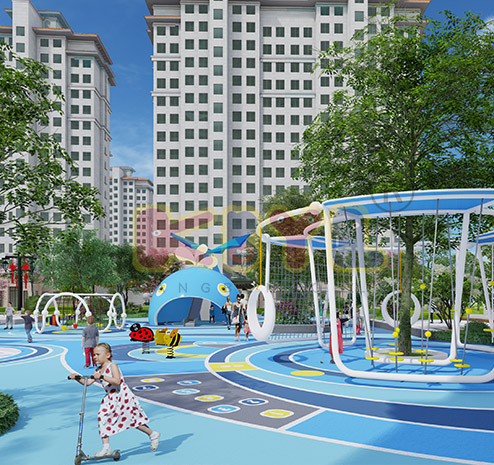 組合秋千不僅僅設置不同尺寸的單人秋千,更體貼的配有親子秋千鼓勵成人與孩子共同參與,促成互動以增進情感交流。一并整合在大圓環里的還有攀爬與拉伸器械,讓全齡段的人群無邊界的在同...